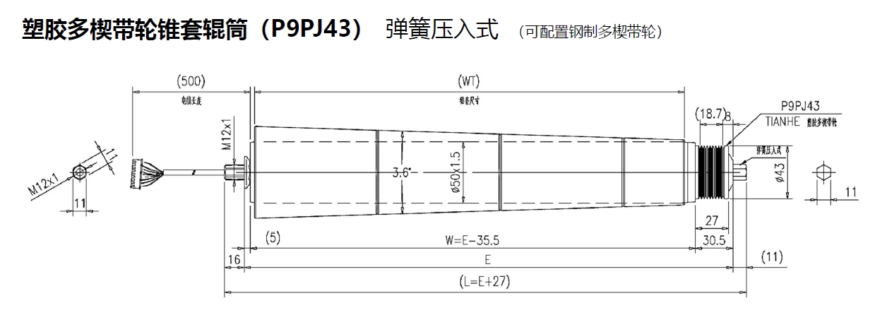 電動輥筒 塑膠多楔帶輪錐套輥筒(P9PJ43) 彈簧壓入式 (可配置鋼制多楔帶輪)